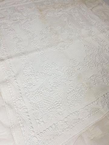 Beau "Boutis "chauffe-pied", ou courtepointe en broderie de Marseille datant de la fin de la période Louis-Philippe. Très fine et légère courtepointe en batiste de coton blanc, brodée au boutis au point avant. Dessin à disposition traditionnelle à grand réserve à petit latti et rosace centrale. Entrelacs ondulés de marguerites à quatre écoinçons chargés de cornes d'abondances stylisées. Courtepointe au boutis réversible dont les volants sont d'origine en mousseline de coton finement plissés en religieuse. A noter de de très légers jaunissements difficile à voir en vrai. la baptiste de coton et le boutissage restent en excellent sans tache, ni trou. Très Bon état général de conservation.