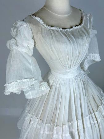 Une robe de promenade à crinoline ronde en mousseline blanche - France Circa 1845-1855