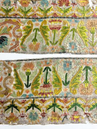 Bordures en broderie de Buratto, soie polychrome sur voile de lin - Italie XVIe-XVIIe siècle