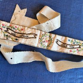 A wedding garter in embroidered taffeta with the words ‘Les deux sont unis’ (The two are united) - France, circa 1850