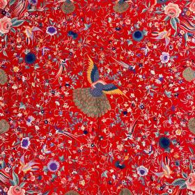 A Canton shawl in red taffeta embroidered with peacocks - China for export to Europe Circa 1880-1900