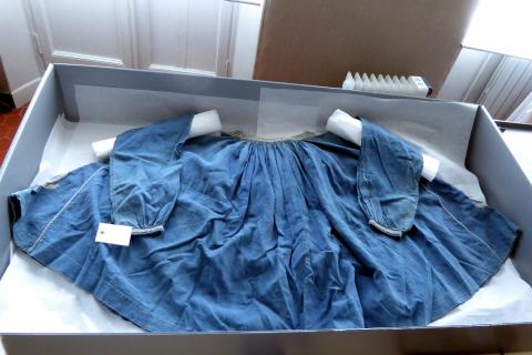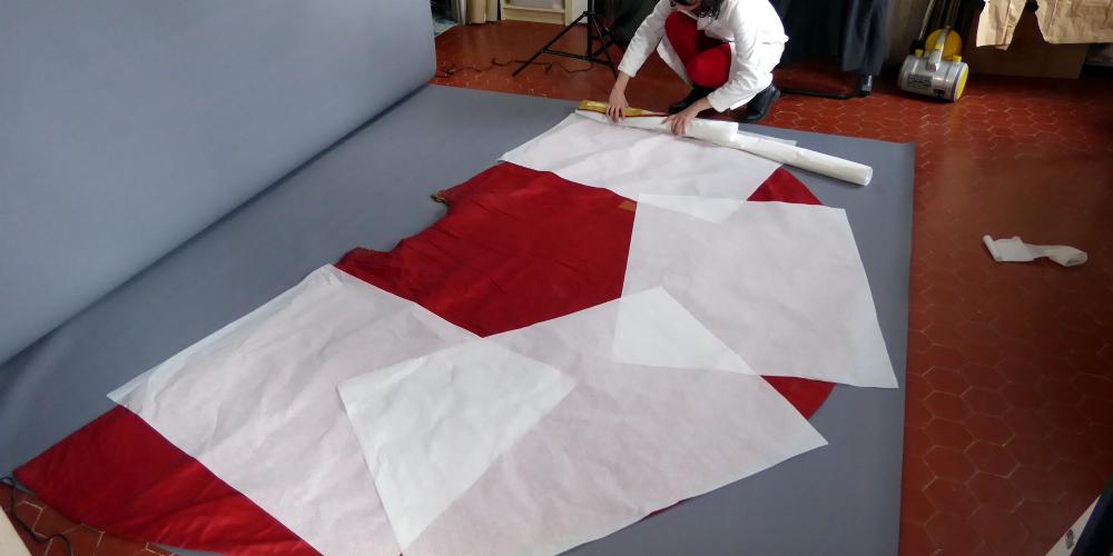 Le reconditionnement et les mesures de conservation préventive et curative : Le reconditionnement des pièces est pensé de manière à remettre en forme mécaniquement les éléments textiles grâce à l’action du temps. Ceux-ci sont adaptés en fonction des spécificités physiques, typologiques et structurelles des œuvres, garantissant l’intégrité matérielle des biens sans risque de perte de matière ou de fragilisation durant le transport retour.
