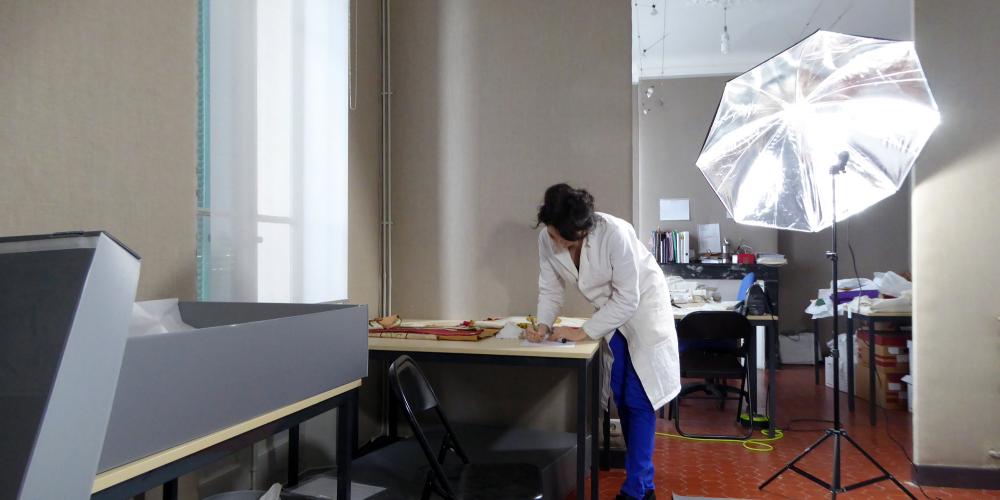 Le traitement des trois- mille cinq-cents objets textiles et ethnographiques des deux musées est réalisé au sein de l’atelier Villa Rosemaine. Une chaine opératoire à caractère systématique est mise en œuvre :