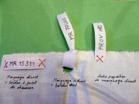 Le marquage : Toutes les étiquettes anciennes et inadaptées sont enlevées, remplacées par un marquage direct ou indirect en fonction des spécificités de l’objet. Le marquage sur bolduc cousu est utilisé lorsqu'aucune attache de ficelle et étiquette Tyvek ® n'est possible. Celui-ci est effectué avec une encre de qualité permanente de qualité conservation, placé de manière visuellement accessible.